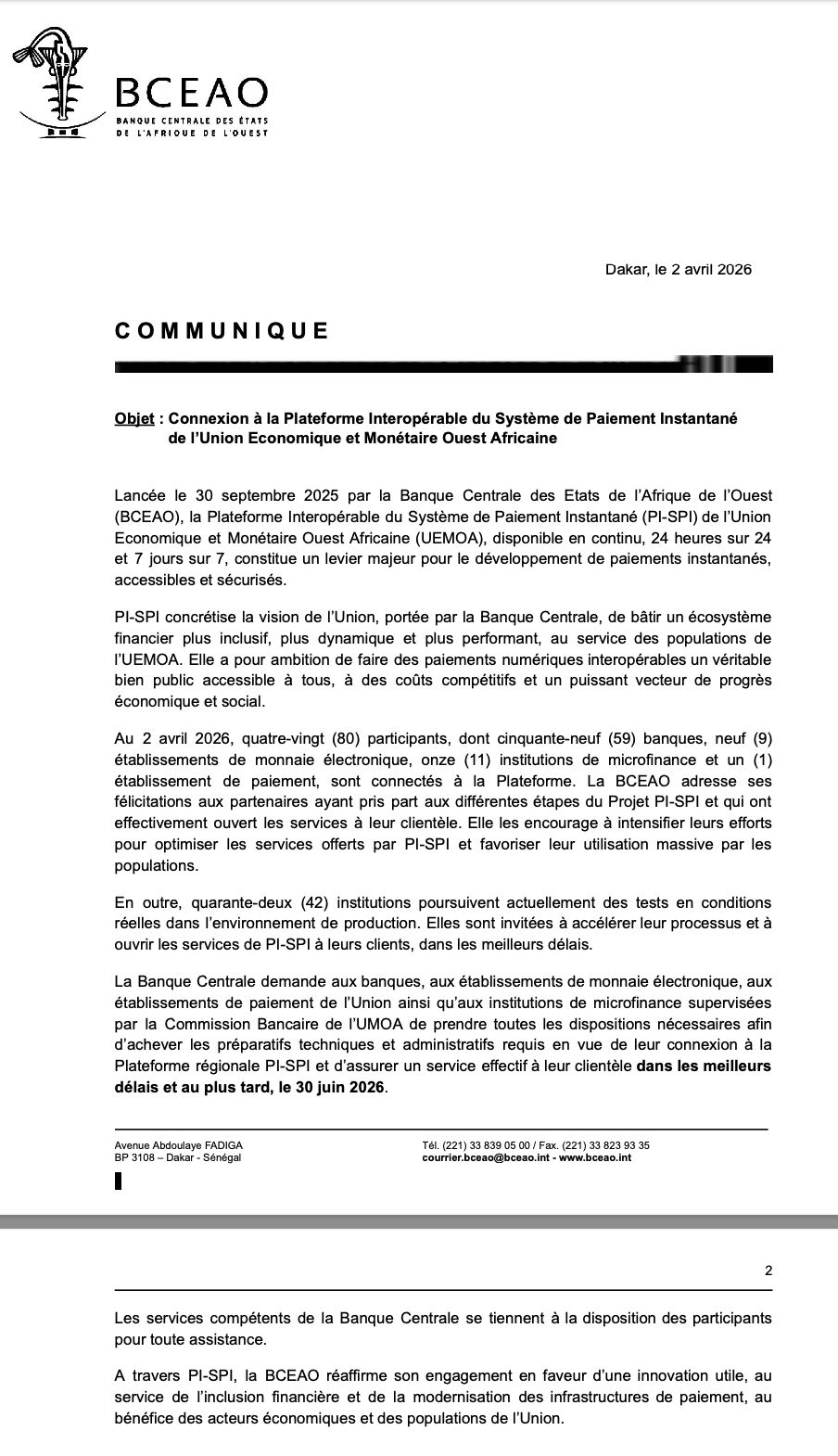 Connexion à la plateforme interopérable du système de paiement instantané de l’Union Economique et Monétaire Ouest Africaine