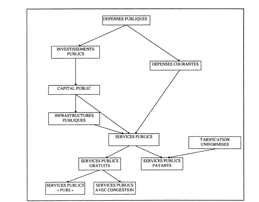 Par contre les relations entre dépenses publiques et services publics et les concepts auxquels ils se rattachent ne sont généralement pas définis. Ce manque de précision peut causer certaines confusions. Par exemple, on confond souvent les infrastructures et le service qu’elles offrent. Les services fournis aux agents sont également souvent mesurés par la dépense qu’ils nécessitent, alors que cet amalgame impose des hypothèses non négligeables.